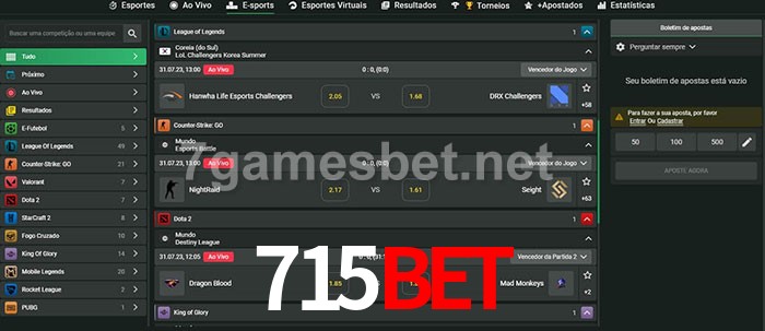 O 715Bet oferece uma grande seleção de opções de apostas em e-sports com probabilidades competitivas